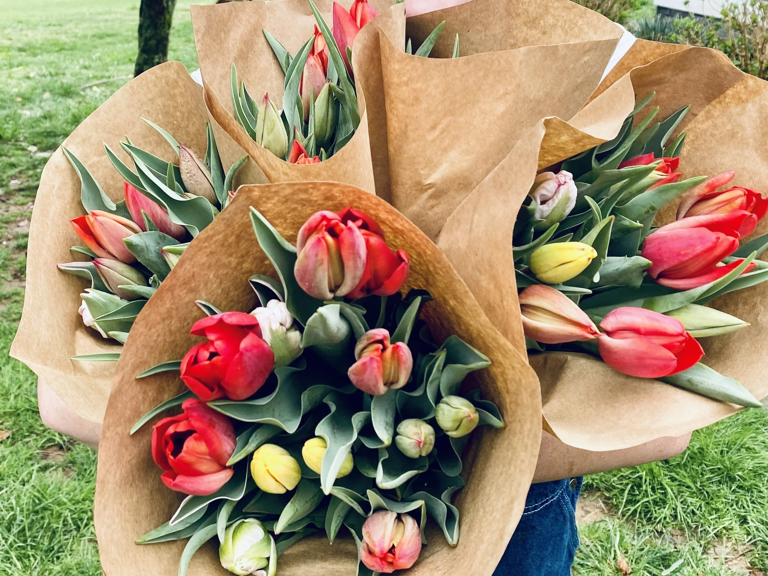 Give the gift of spring! 24 mixed variety paper wrapped tulips available the day after harvesting, these beauties will continue to grow and open for a week or more. When placing your order, in the section titled “Is This a Gift?”, please write your message as you would like it to appear on the tag. In the section titled Additional Notes, please include the recipient’s name. We will contact you when tulips are ready for pick up at our stand.